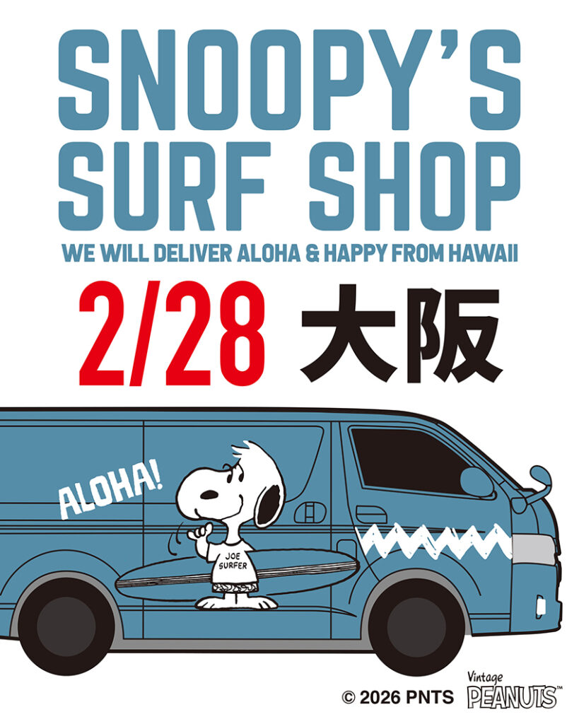 On Saturday, 2/28, the SNOOPY’S SURF SHOP mobile shop will be stopping in Osaka City, Osaka Prefecture!
