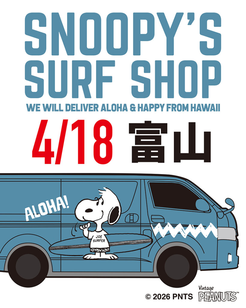 SNOOPY’S SURF SHOP Mobile Store will be stopping in Toyama City on Saturday, April 18!