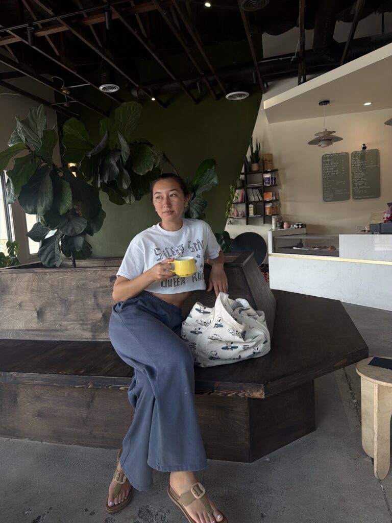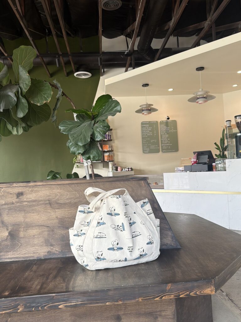 素敵なコーヒー屋さんに座るスヌーピーズサーフショップのバッグ。