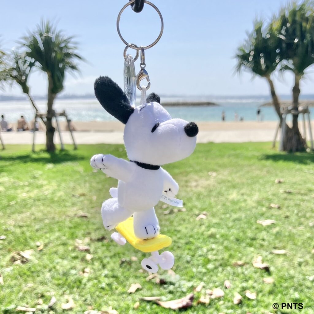 A popular mascot keychain featuring Snoopy on a skateboard, available only at the Naha store!