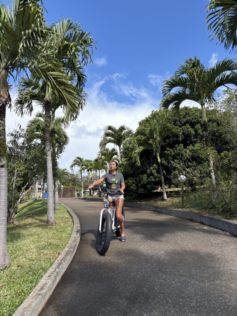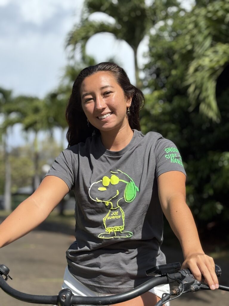 そんな日はついつい外に出たくなる。スヌピーズサーフショップのモデルをしているサリーも、ほら、今日は自転車でワークアウト。